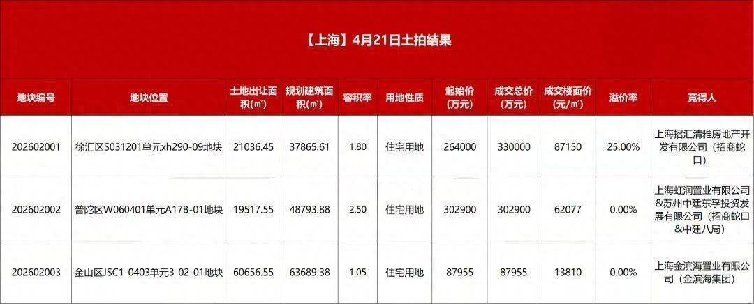 4月21日,上海2026年第三批次住宅用地土拍正式开拍,共推出3宗涉宅用地,总出让面积约10.12万平方米,起始总价约65.49亿元。最终3宗地块全部成交,总成交金额72.09亿元。