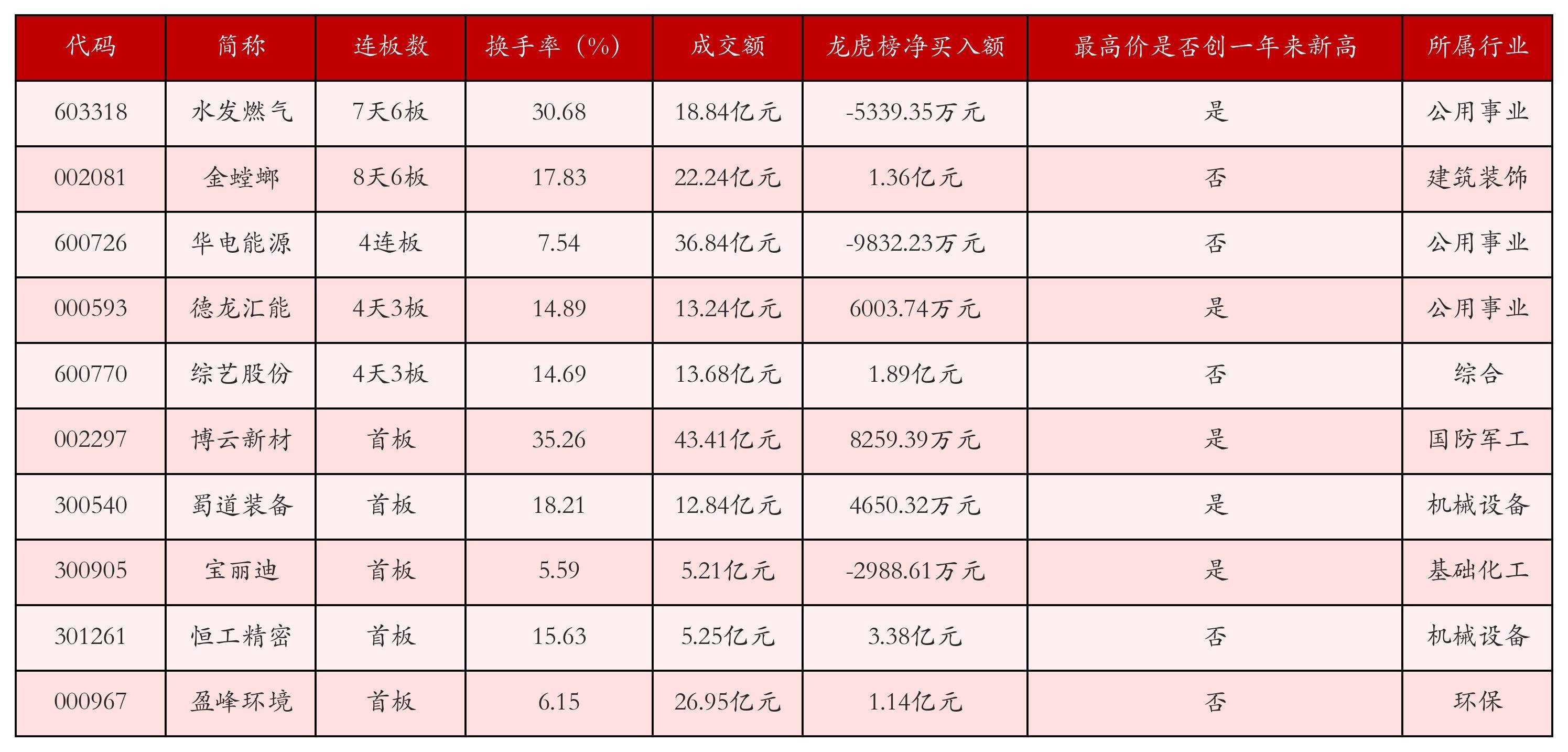 截至4月28日收盘,上证综指下跌0.19%,收于4078.64点,深证成指下跌1.1%,收于14830.46点,创业板指下跌1.43%,收于3596.71点。今日沪深两市A股共计76只涨停,综合当前连板数以及当日龙虎榜数据,其中较为强势的前三只个股分别为:水发燃气(603318)、金螳螂(002081)与华电能源(600726)。今日强势个股前10位具体数据见下表: